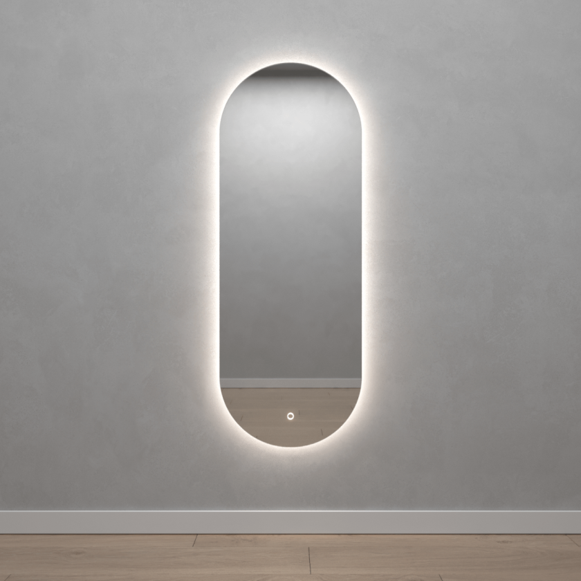 Безрамное зеркало овальной (капсульной) формы с контурной (тыльной) тёплой подсветкой, свет 3000К. Подложка из высококачественного МДФ, светодиодная лента защищена матовым свето-рассеивателем от попадания пыли и влаги. Есть вывод 220W для подключения к сети, включение подсветки от сенсорной кнопки на зеркале.